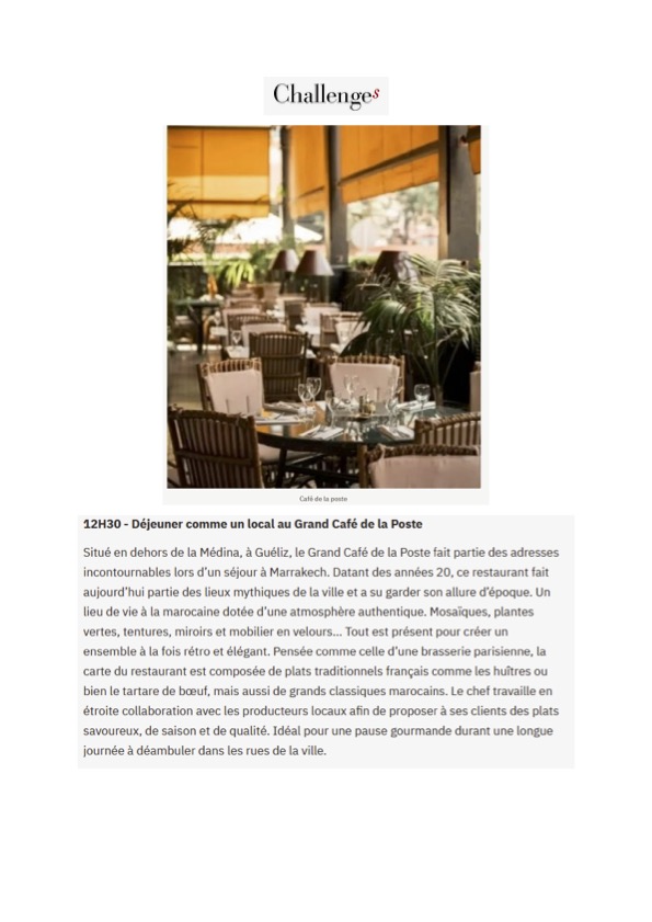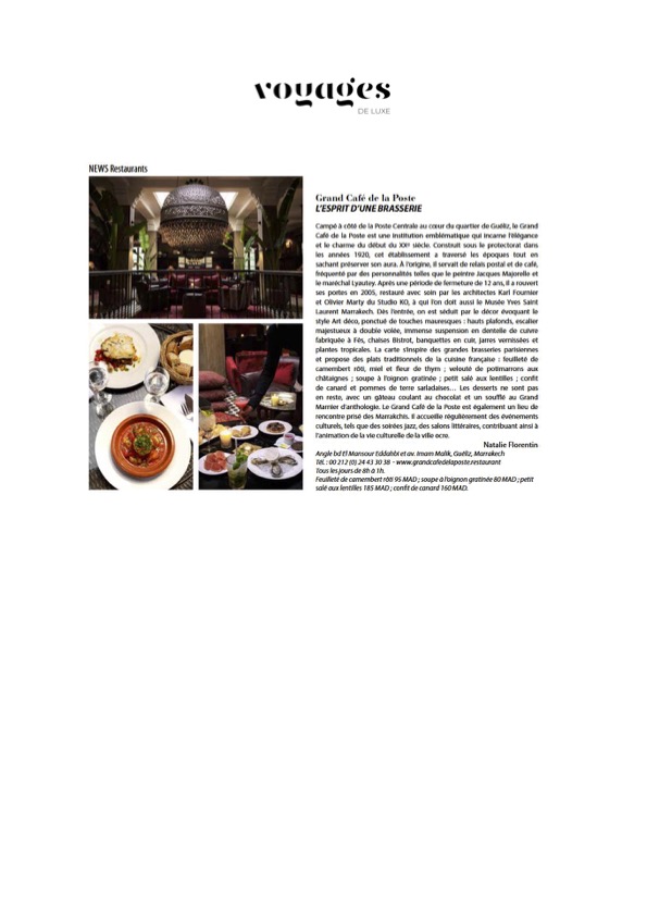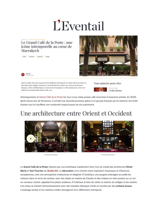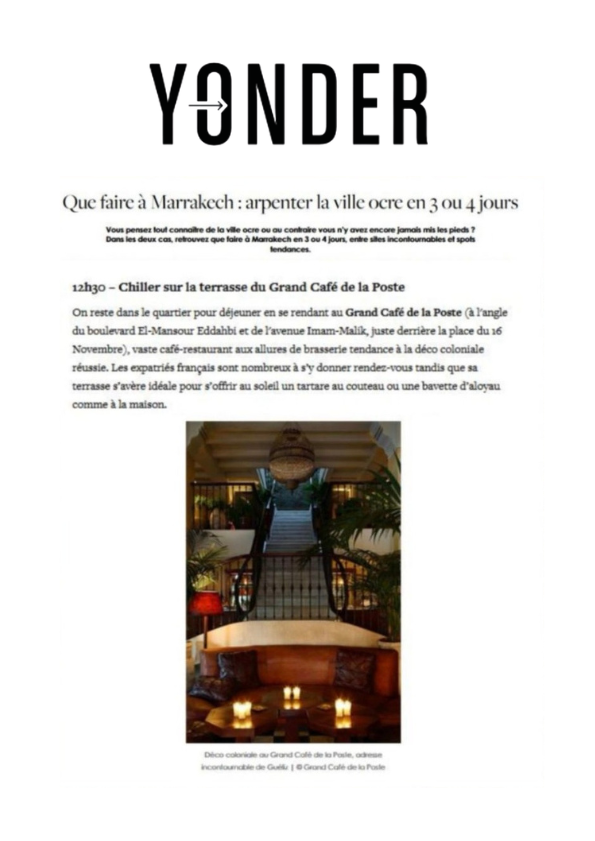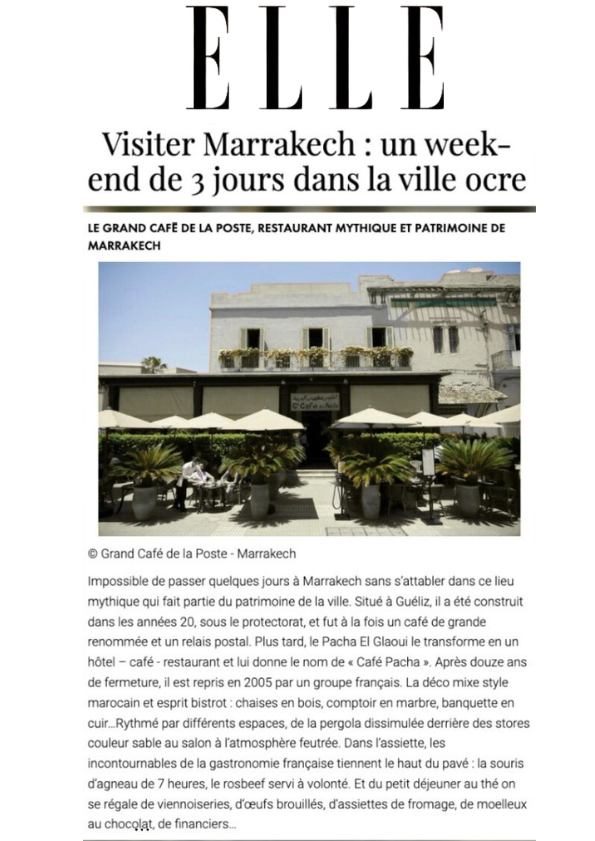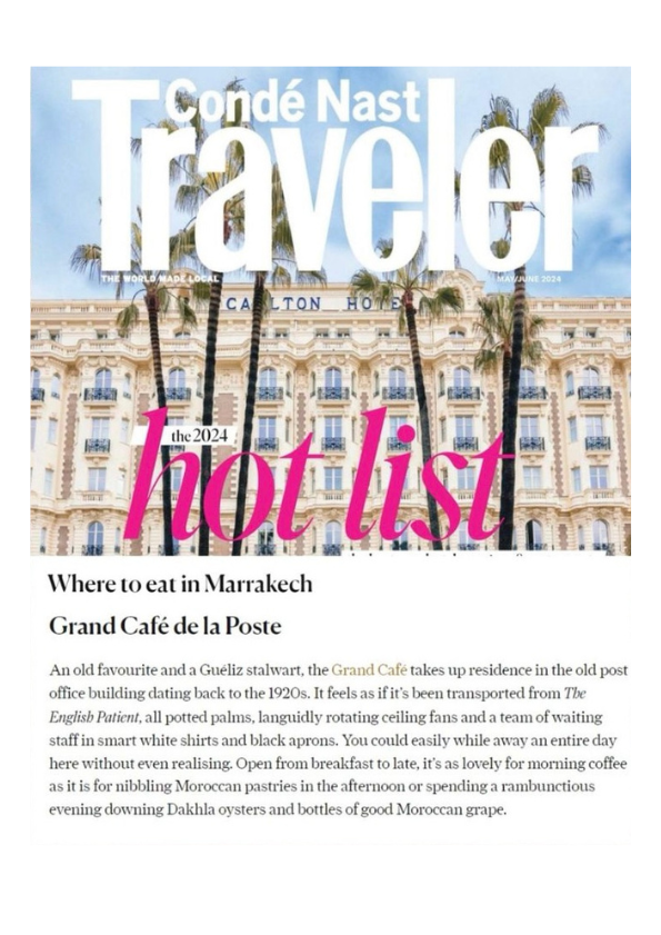 Salué par la critique comme une icône intemporelle, le Grand Café de la Poste est régulièrement célébré par la presse internationale. De Elle à L’Officiel, les médias reconnaissent en notre maison une institution incontournable qui incarne l’élégance et l’âme de Marrakech.